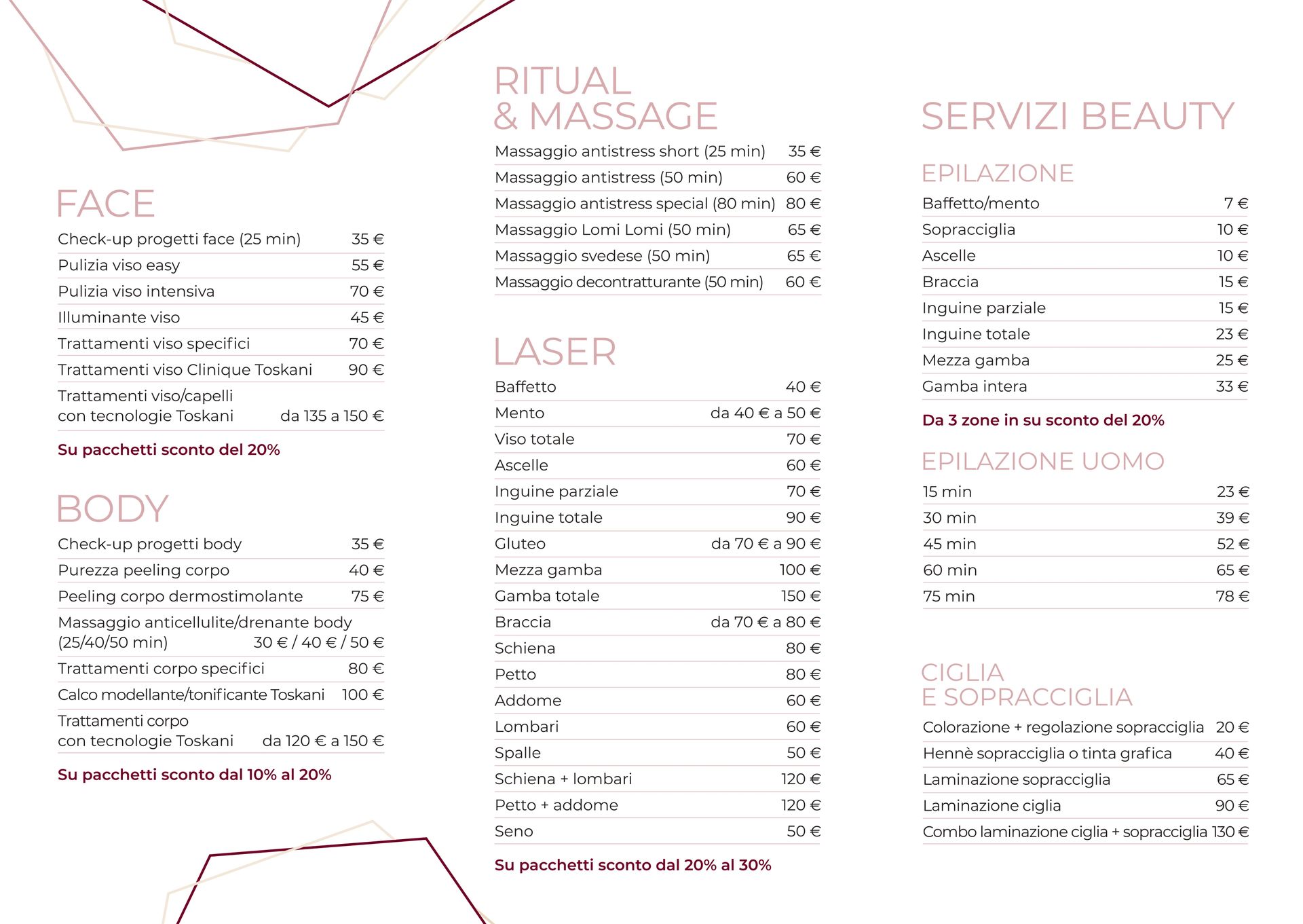 Tra i servizi vi sono manicure e pedicure, trattamenti viso, tra cui quelli antiage, trattamenti corpo come epilazione e scrub.
